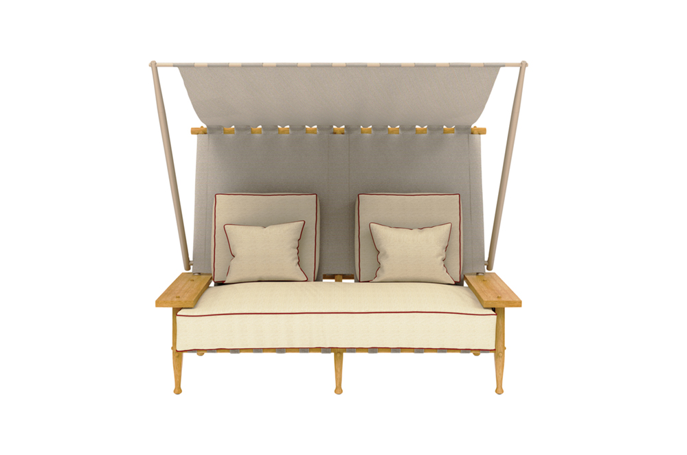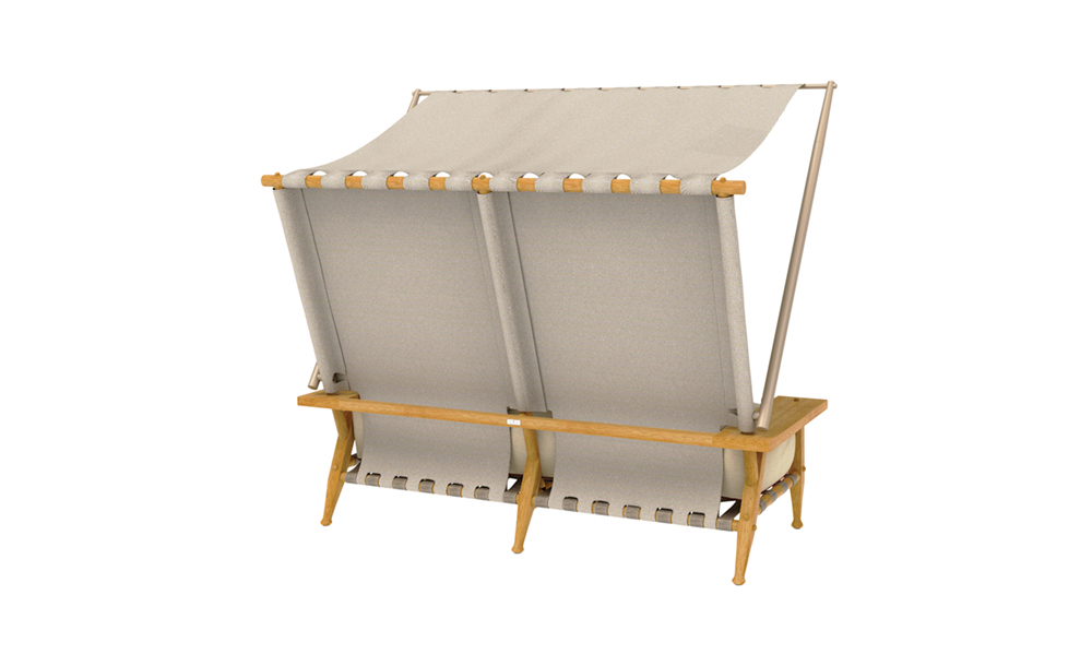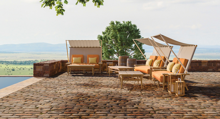 One of Serengeti’s most distinctive pieces is the two-seat, high-back sofa with its clever, integrated awning, a chic solution for sun protection, whether gazing across the plains, relaxing on the veranda, or lounging poolside.