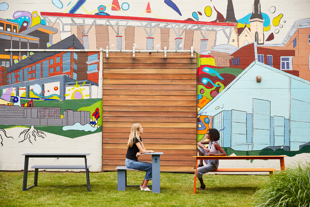 Arranged in a grid, Take-Out makes for a lively outdoor café atmosphere.