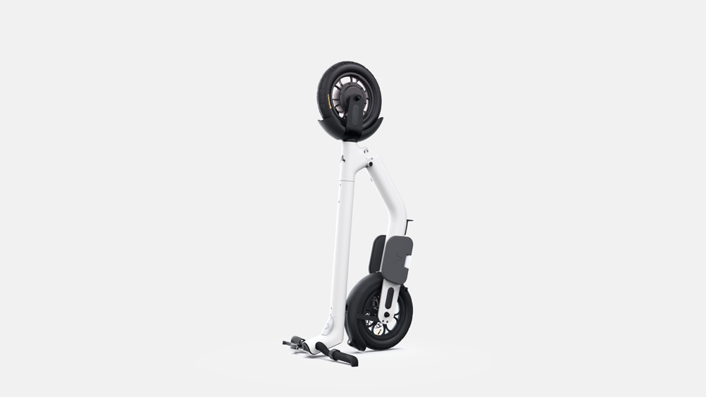 It replaces the traditional skateboard-style ‘deck’ – which forces the rider to twist their body – with foot platforms which fold down from the central frame.