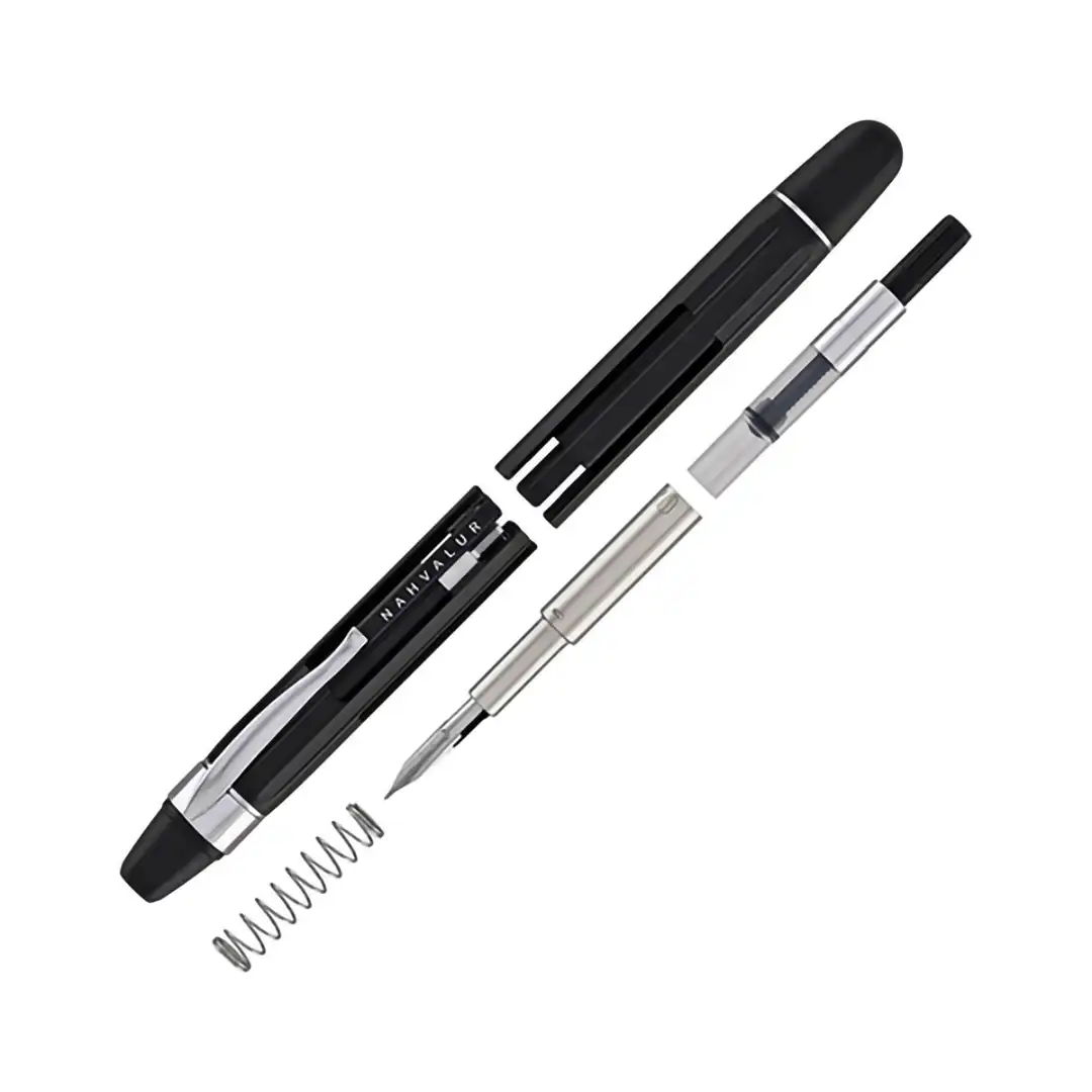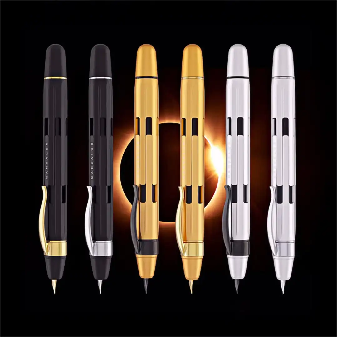Nahvalur’s first-ever retractable fountain pen, featuring a faceted aluminum body that collapses effortlessly to reveal a stainless steel nib. Available in three stunning colours with two trim options each, the Eclipse has a spring-loaded, button-free mechanism and a removable clip.