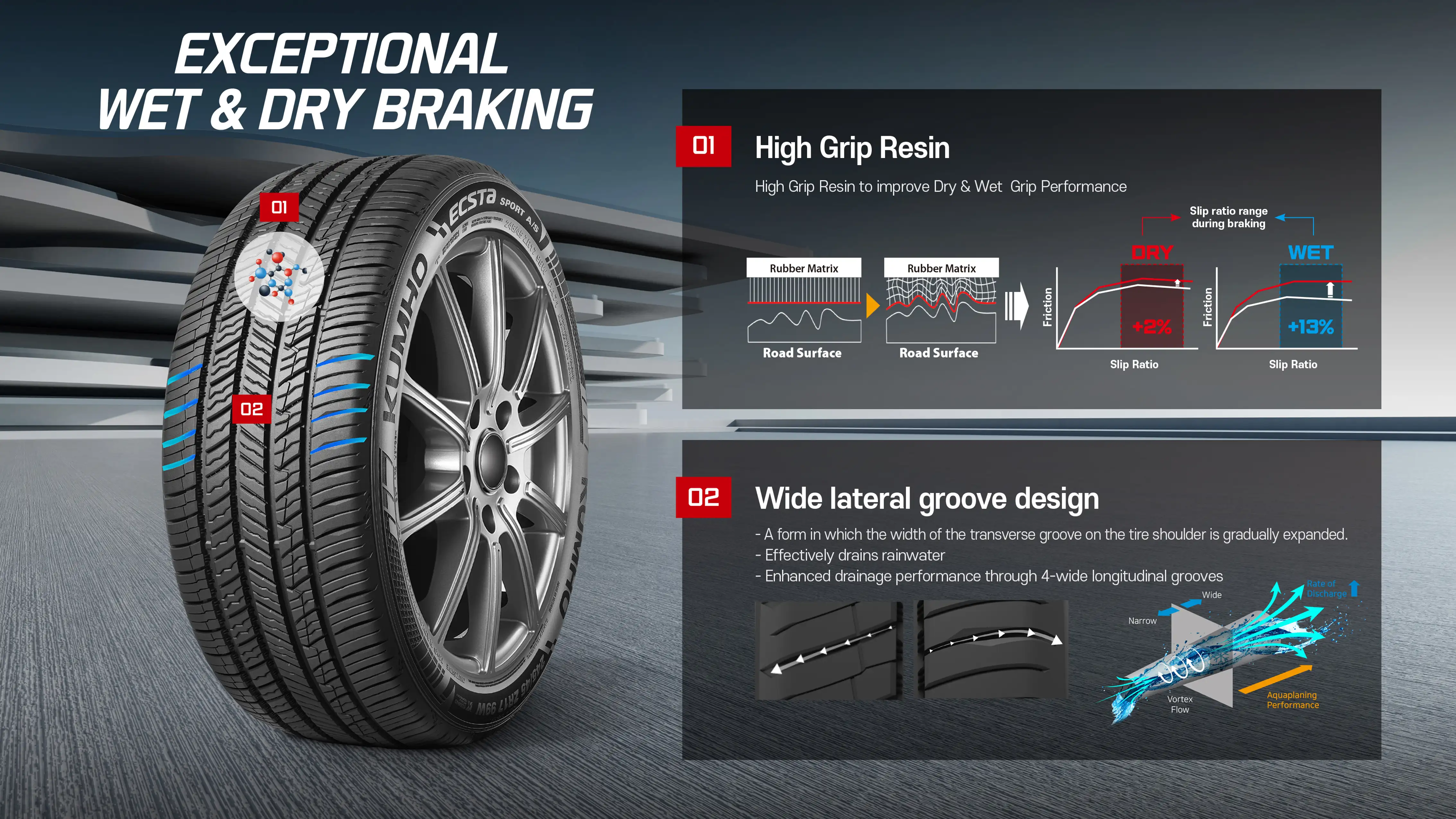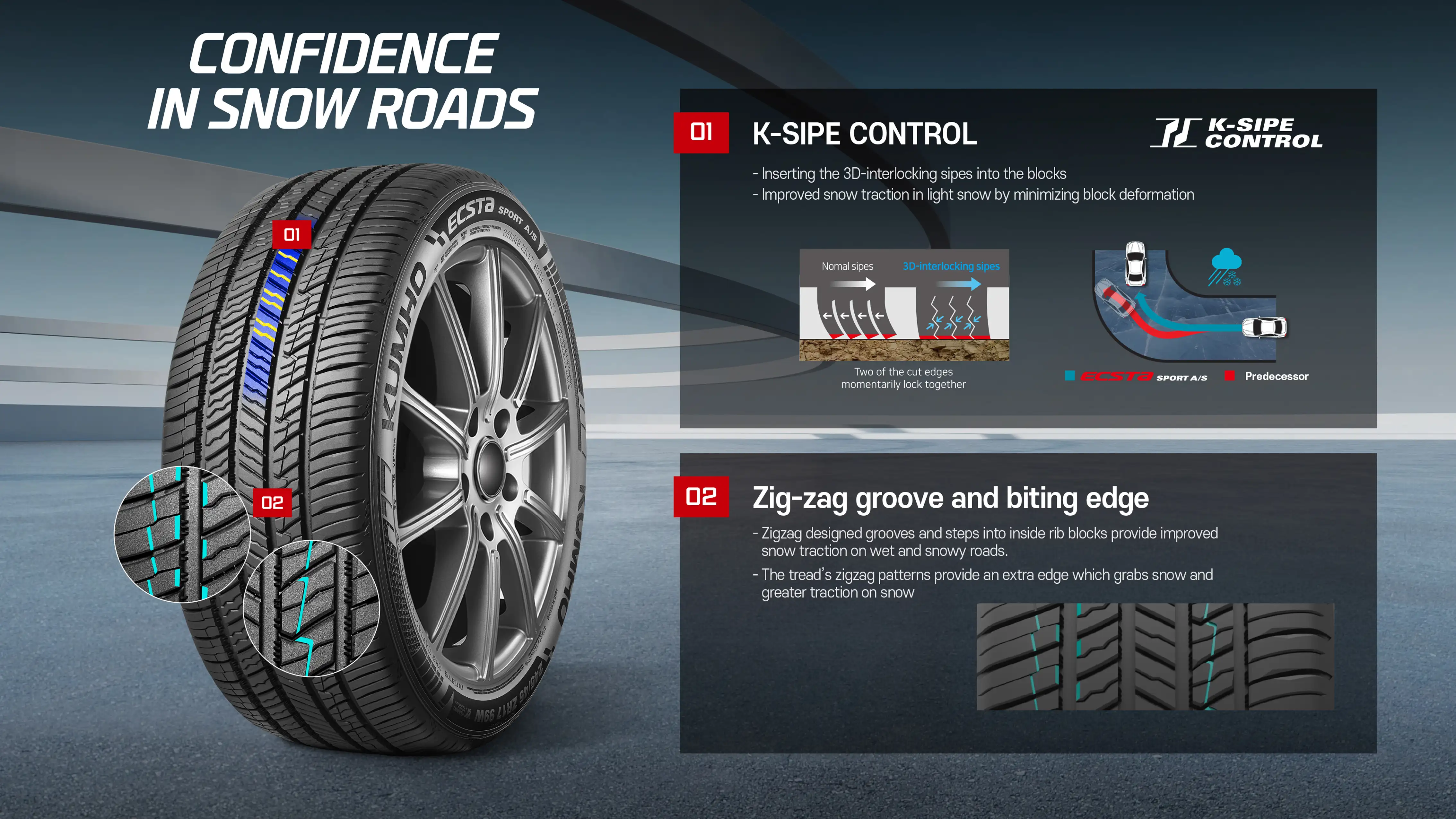 "ECSTA SPORT A/S" has applied a longitudinal groove design that incorporates tire pattern noise reduction technology to disperse the noise caused by the flow of air concentrated in the tire groove when driving. In addition, a tire structural design optimised for air resistance has been applied to reduce energy loss from the tire due to air resistance during high-speed driving, and a multi-sipe design has been applied to the tire tread pattern to enable tire use in all-season environments.