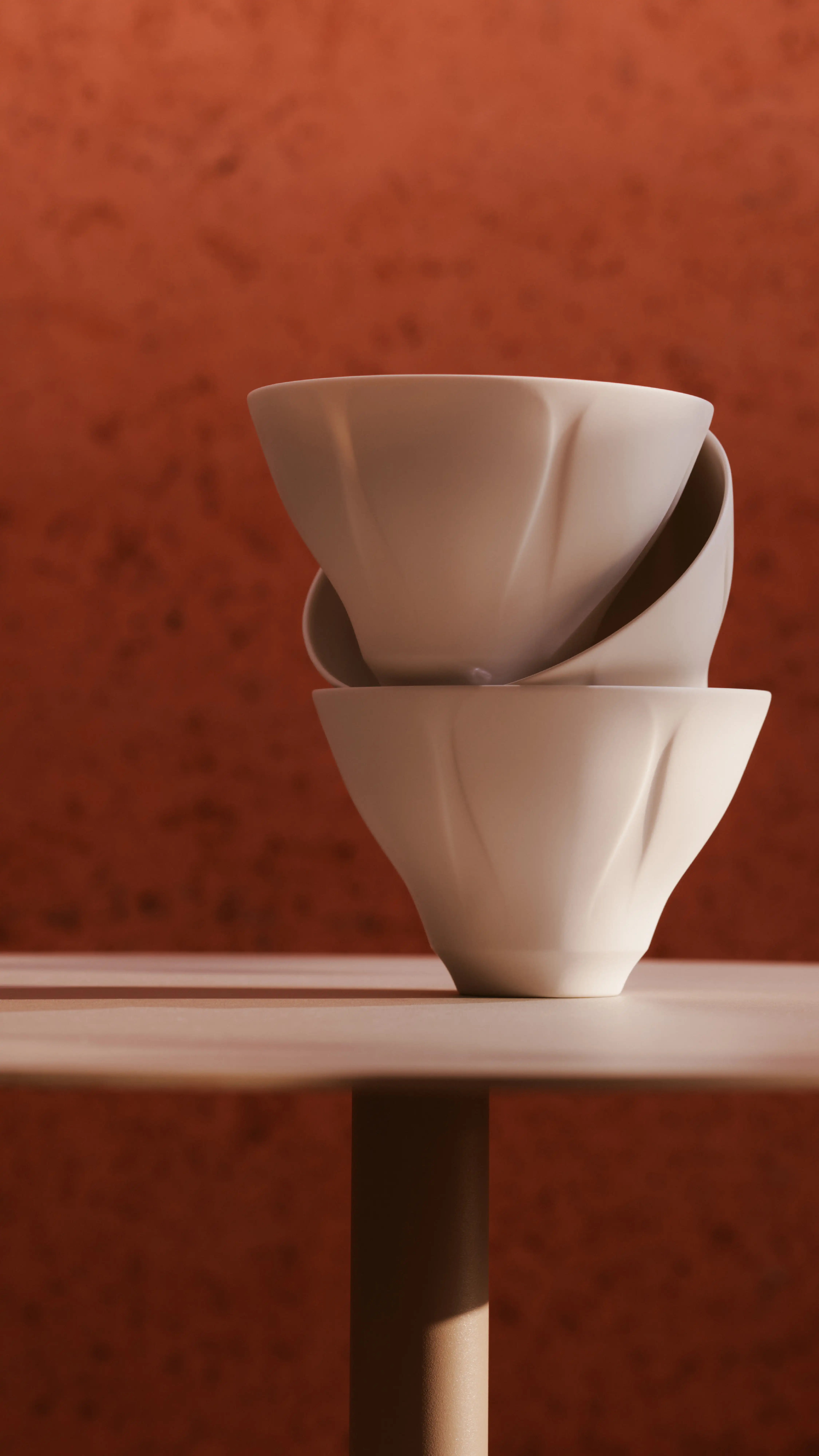 The intricate shapes of Evolution push traditional manufacturing processes to their limits. Elaborate testing cycles and phases of integration begin during the design and tooling stages, as the manual refinement processes typical of our biscuit porcelain - from smoothing and sharpening to the final polish - become exceedingly labor-intensive due to the complex shapes.