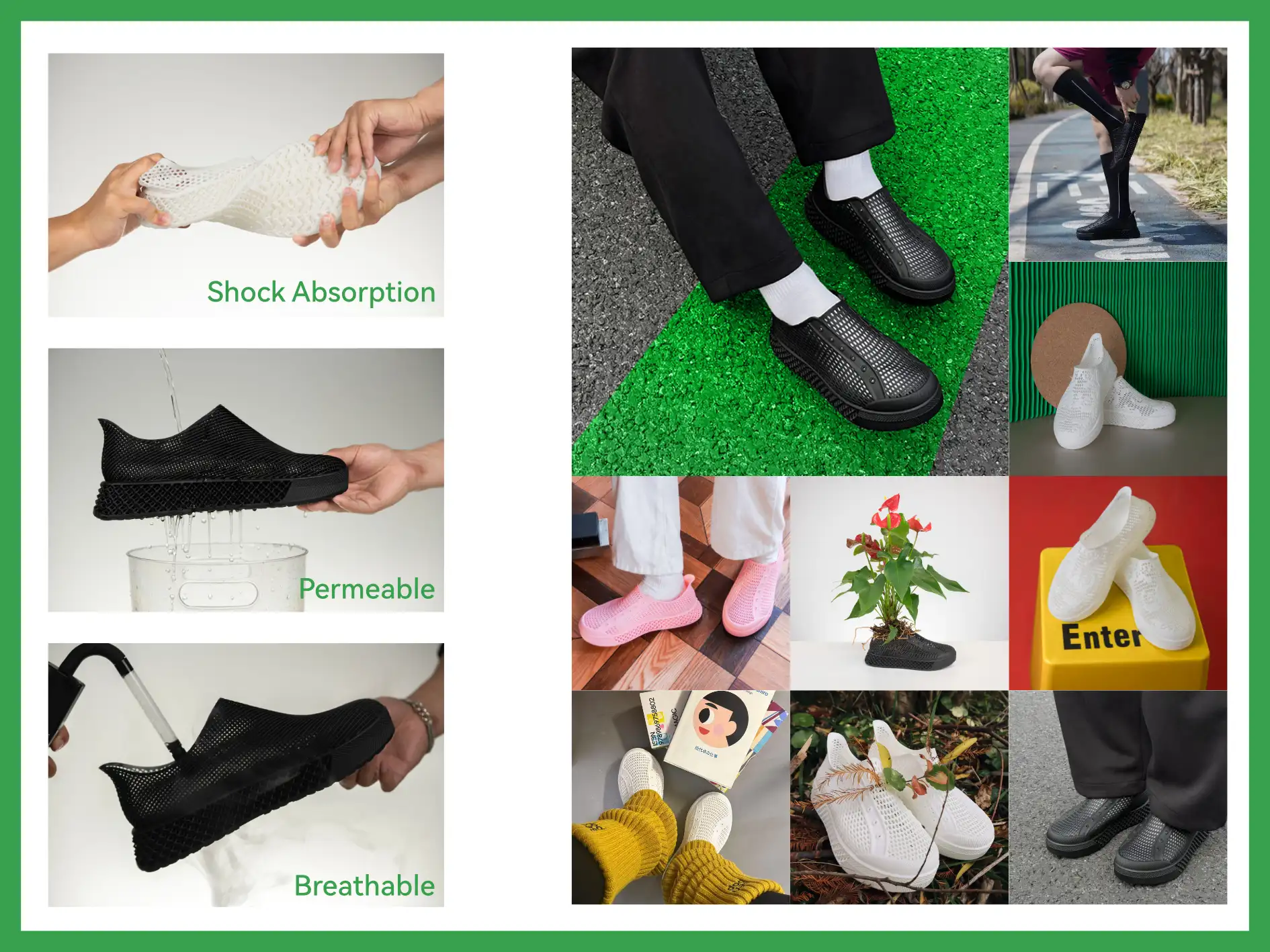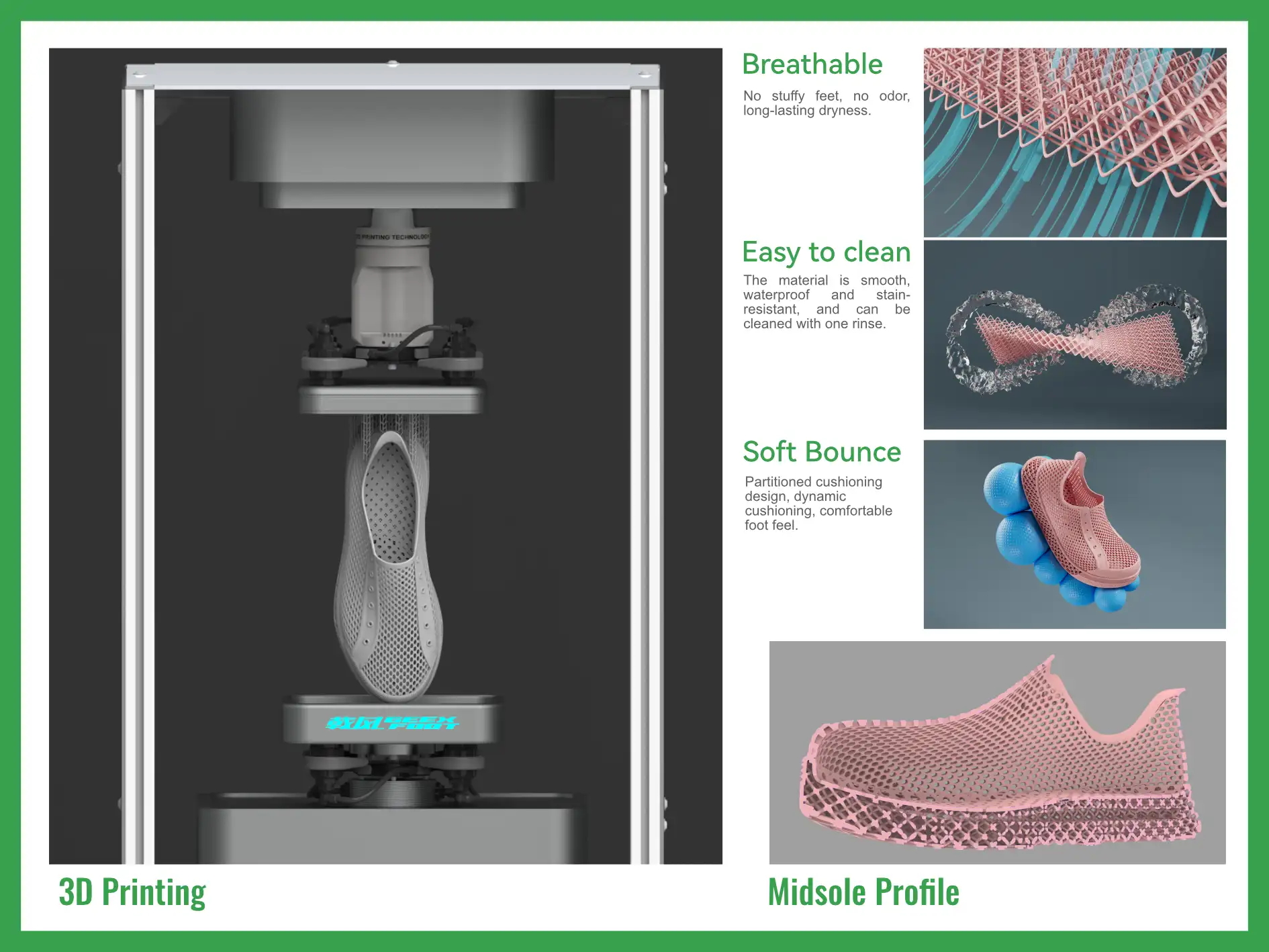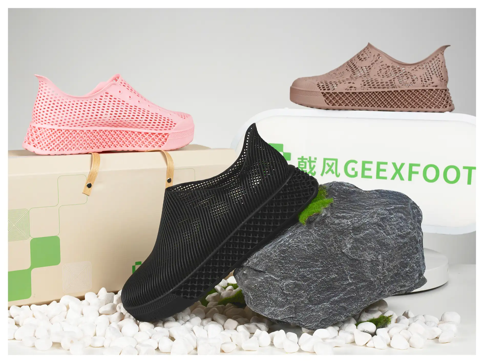 Designed to solve the problem of heavy, stuffy, and stiff sneakers, this footwear delivers 3D-printed comfort, breathability, and all-day versatility. It is implemented using ultra-light, breathable, and ergonomic 3D printing methods, made from recyclable materials with a 50% lower carbon footprint. The result is breathable, durable, and stylish shoes that provide ergonomic support for all-weather urban wear.