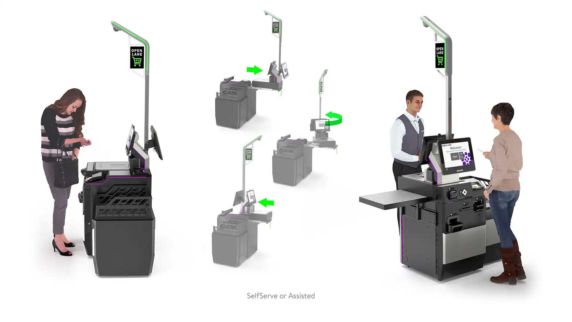 Built for modularity, the system allows easy swapping of components and supports upgrades to different display sizes, instant lane conversions between assisted and non-assisted modes, bi-directional workflows, and branding options. It’s scalable, compatible with advanced technologies like RFID, palm payments, and computer vision, ensuring future-proofing. Accessibility is enhanced through reduced terminal depth and repositioned peripherals to accommodate diverse global users, including both standing and seated customers.