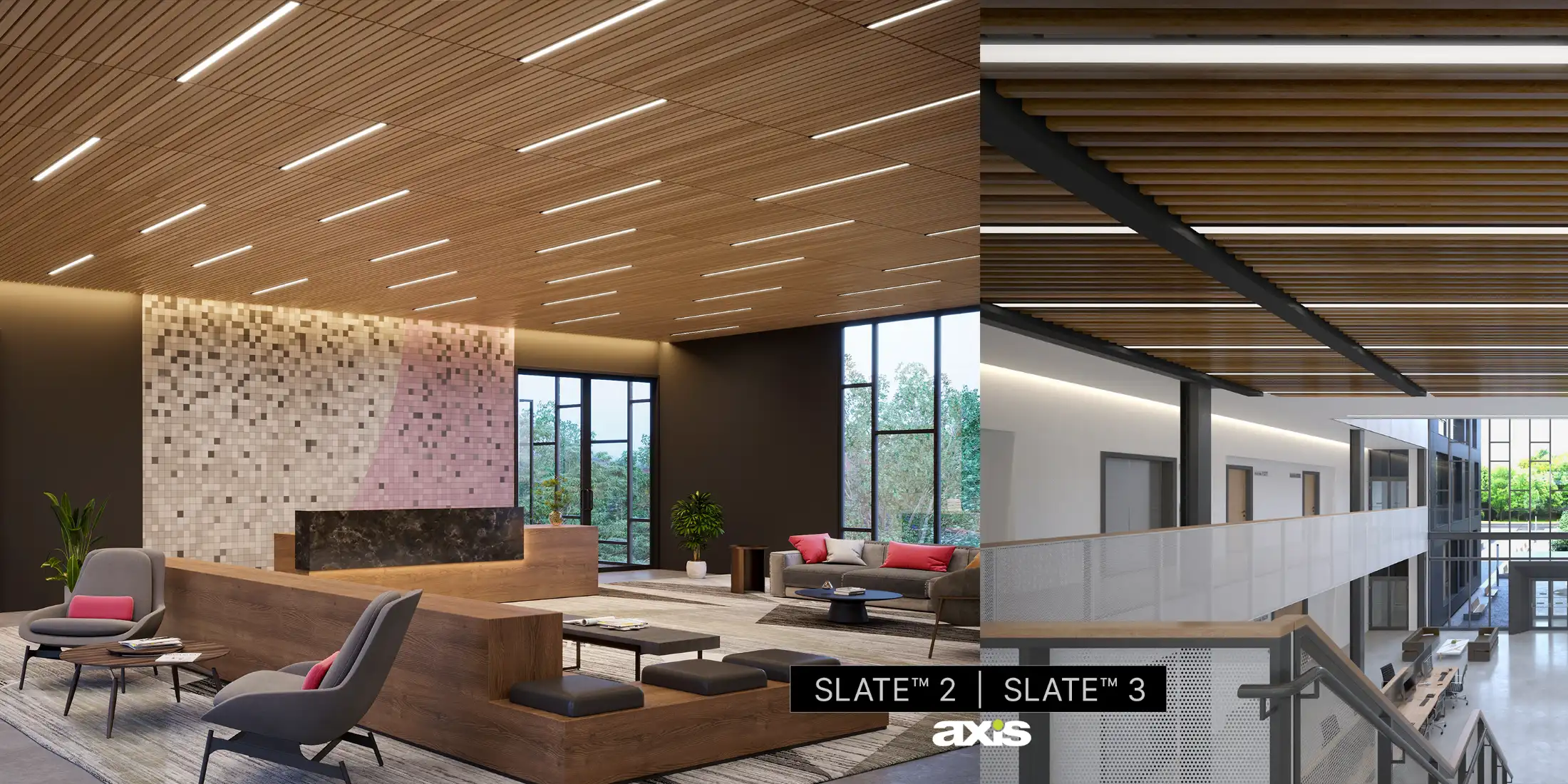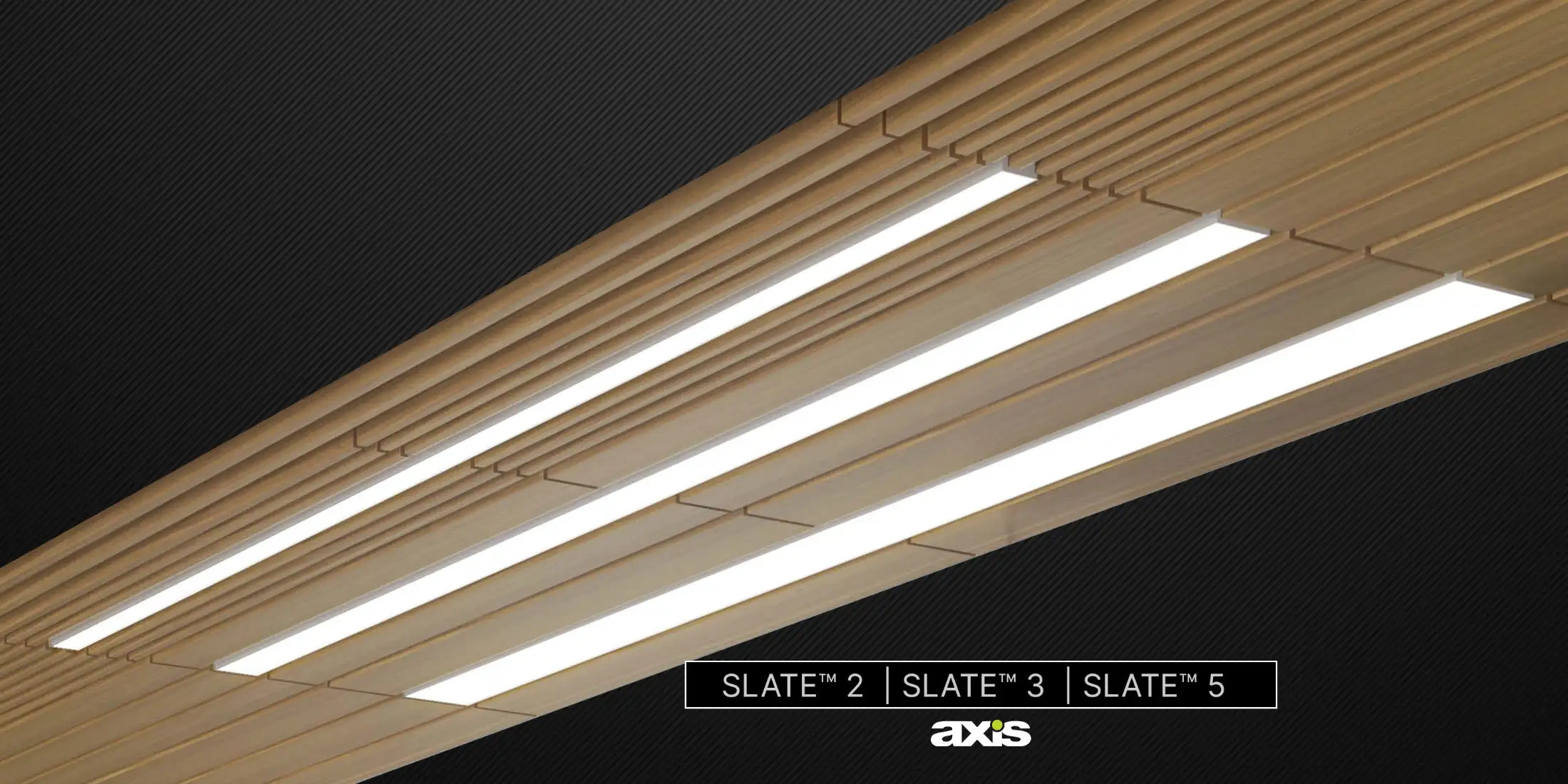 Slate 2, Slate 3, and Slate 5 offer a choice of aperture widths—2”, 3 1/4″, and 5 1/4″—making them ideal replacements for most wood slat sizes. Featuring a streamlined flat-style housing that is only 1″ deep, these luminaires incorporate a patent-pending optical system with a single-side edge-lit lightguide. They are also compatible with Armstrong® WoodWorks® ceiling systems, as evaluated by Axis Lighting, ensuring seamless integration in a variety of architectural applications.