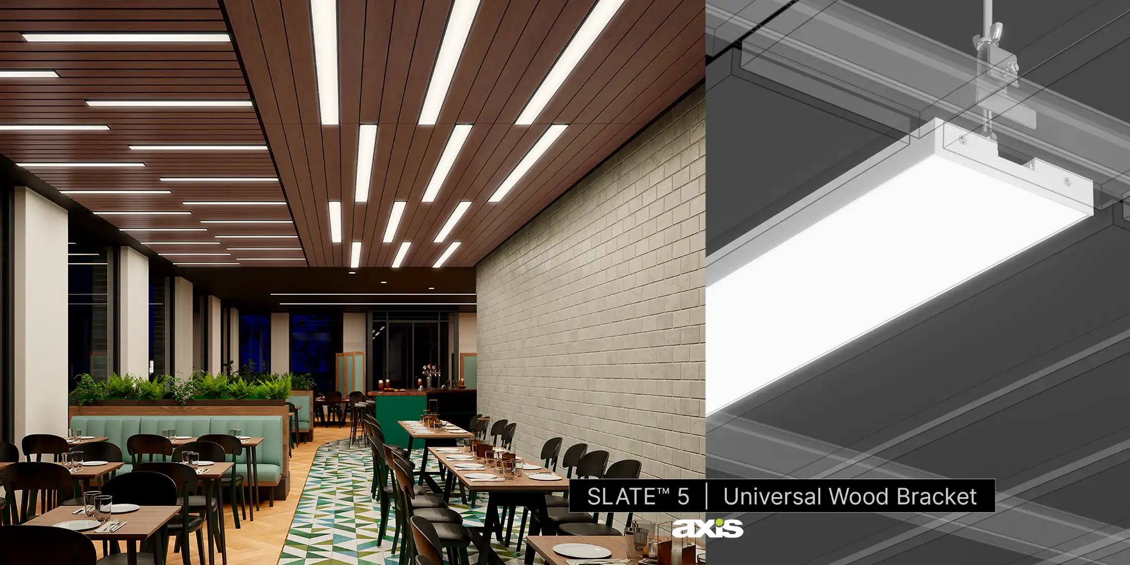 These minimalist, refined products enable cost-effective architectural lighting layouts and hassle-free installation with easy height adjustments using the patent-pending Universal Ceiling Bracket (UWB), developed by Axis and delivered with your luminaires. Wood ceiling luminaires typically use fixed brackets. However, Axis has taken a different approach to make installation easier, more convenient and more effective.