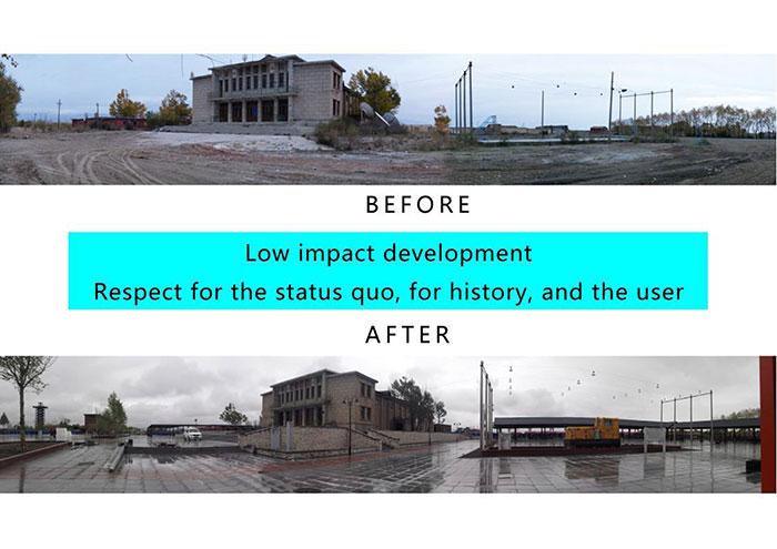 The original factory site has been reused in accordance with the characteristics of industrial sites, using the original materials for the building renovation, in order to strengthen the characteristics of the times and industrial background. The flexible pavement mode of gravel + honeycomb restraint system has been adopted to the new parking lot construction. On one side is to realize the rainwater infiltration function, and on the other side is to reduce the problems of the pavement collapse caused by the uneven foundation subsidence that are more common in winter construction.