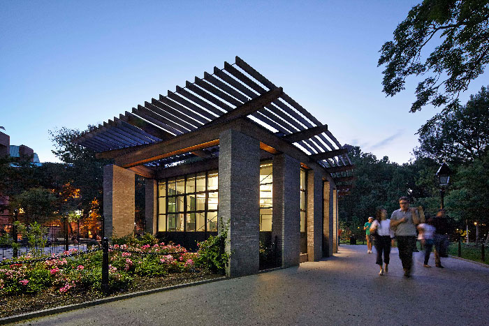 Reducing visual distractions, in addition to noise and nonrenewable energy usage, was also central to the project’s goal of treading lightly. The building’s subtle curvature and tapered ends minimize its mass, while several regionally sourced materials reflect the park’s natural palette. The colonnaded trellis form, an archetype of garden architecture, is topped with redwood reclaimed from New York City water tower tanks and pickle barrels, while the project’s granite was sourced from the New York Champlain Valley. By honoring the natural environment, the tradition of park architecture, and the civic legacy of Washington Square, the design of the park house is able to intrude as minimally as possible on visitors’ connection with the park itself