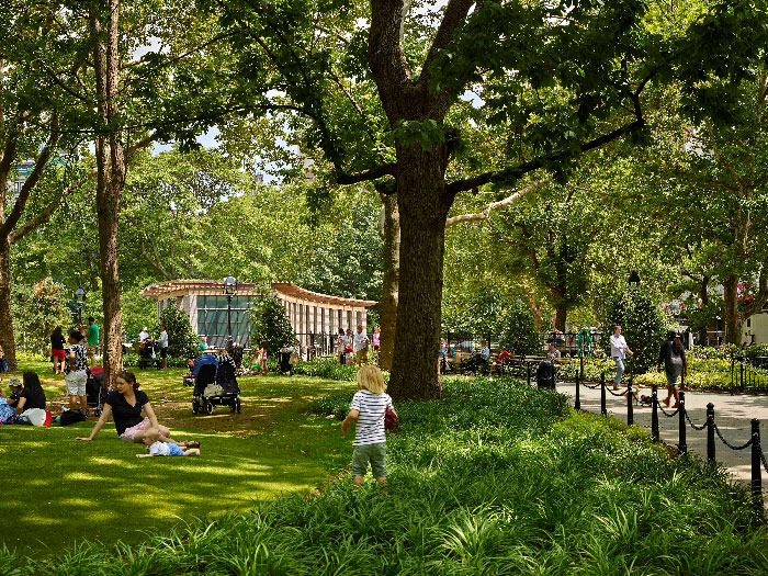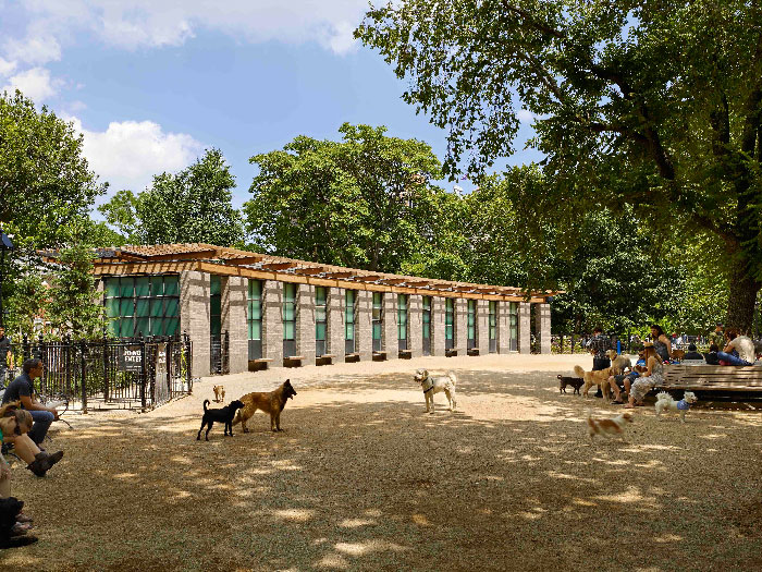 eliminate visual distraction and noise pollution from equipment for park users. The reuse of an existing cellar that houses mechanical equipment for the park’s fountain allowed for minimal disruption of the park’s archeologically sensitive grounds. Other contributors to low environmental impact, as well as increased workplace comfort for Parks Department employees, include the use of low or zero-VOC paints, adhesives, coatings, sealers, and sealants throughout the project, as well as large windows providing ample natural light, passive cooling, and outdoor views. Perimeter seating wraps the exterior, and a covered colonnade provides comfortable shade along an active pathway that is well-lit in the evenings.