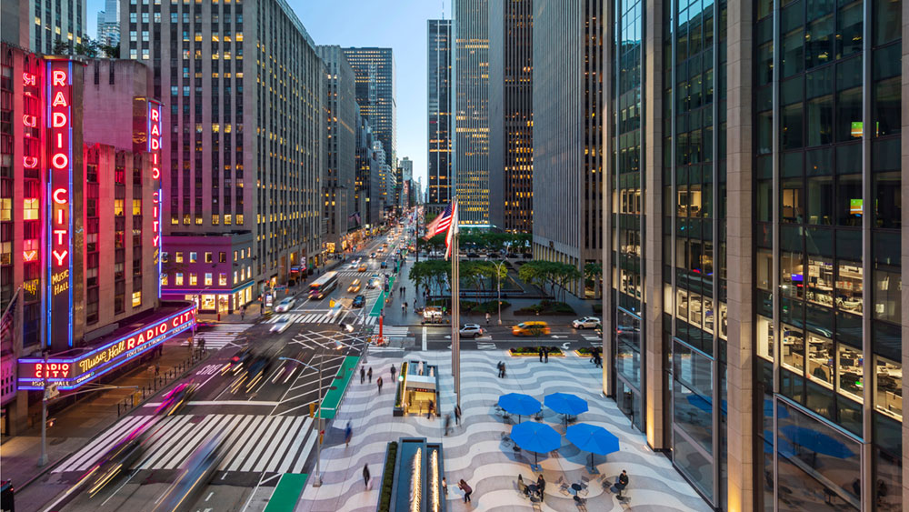 The signature Copacabana paving pattern, recreated in a more durable custom decorative concrete, was extended to the curb, creating a single expansive public space. Evoking the dynamic cantilevered entrance canopies on the 50th Street side, a new canopy extends nearly 100 feet toward Avenue of the Americas, announcing the reopened breezeway and defining the north edge of the plaza while sheltering the retail entrances.
