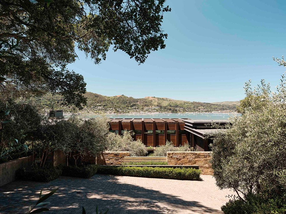 This coastal home is situated on the edge of a precipice that maximizes panoramic views from San Francisco to Mount Tamalpais. Carefully folded into a western hillside overlooking Richardson Bay, it maintains a sense of intimacy by nestling among the live oak trees and Monterey pines that envelope the site.