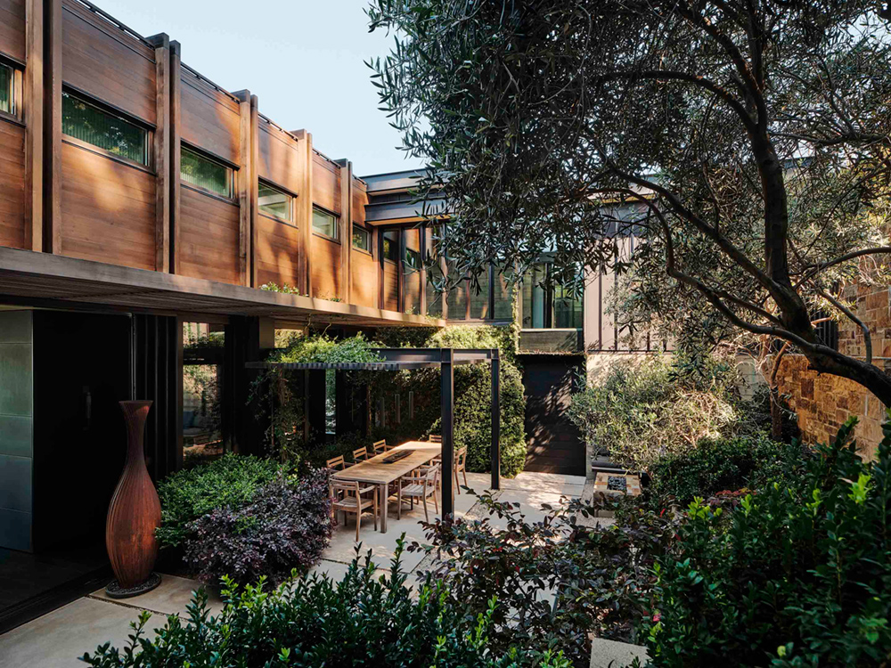 Floorplates and roof planes shift and extend in response to ample solar exposure, while the home's massing creates protected garden spaces that facilitate indoor-outdoor living. Cedar slats stream filtered sunlight into the home's open-air terraces while continuing inside to cover the ceilings and enhance the home's indoor-outdoor experience.