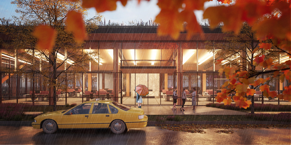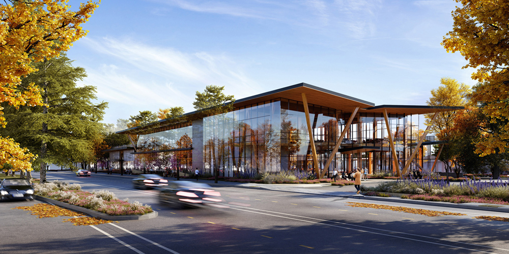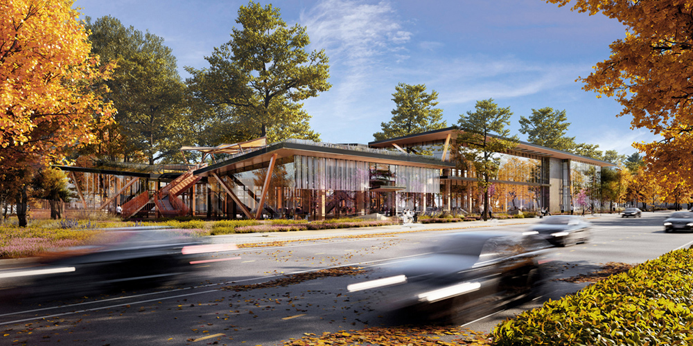 The two-story, 52,872 square-foot office/R&D space emphasizes horizontality through its various roof scales and levels. Projecting and receding volumes create a lively building envelope rather than a static flat facade. A generously scaled main entrance canopy is supported by structural elements that feature mass timber.