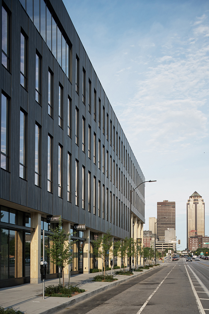 Des Moines’ East Village is on an upswing. Urban infill and adaptive reuse have revitalized the district with apartments, retail options, and office spaces. 111 East Grand is the latest addition to the area, and the first Dowel Laminated Timber (DLT) office building in the United States.
