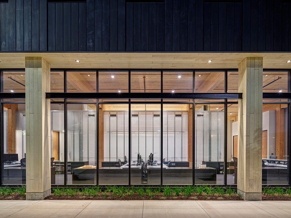 Tenant improvement work like drop ceilings and wrapped columns has been minimized. On the exterior, natural Accoya wood soffits and columns hint at the material used for the structure and complement the exposed wood interior.