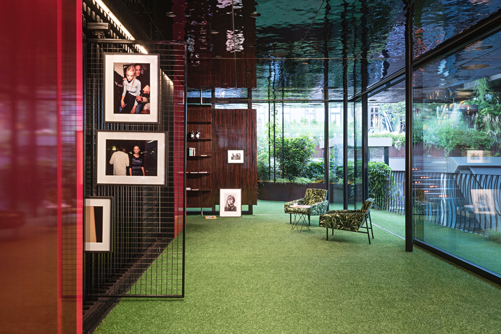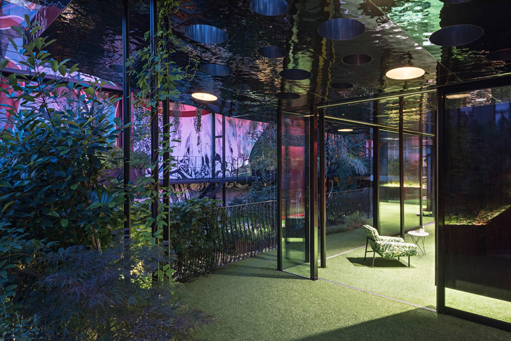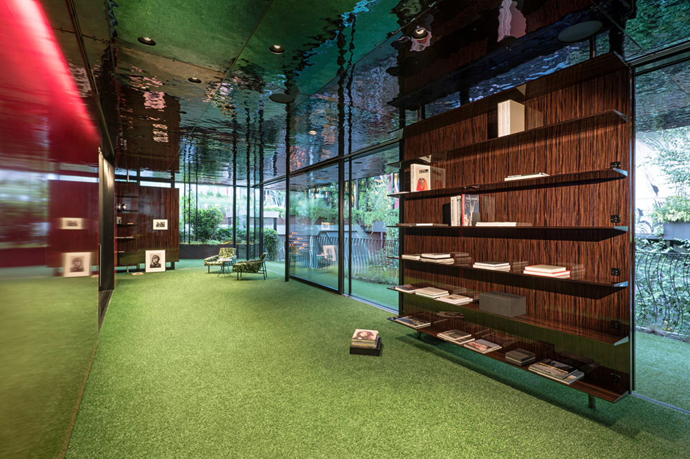 A continuous flooring covered with lime-green artificial grass allows to completely open up the interior to the outdoors and truly blend them together.