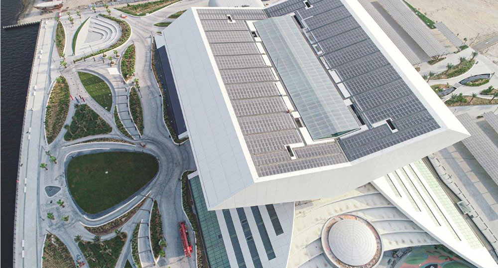 Provision for one megawatt (1MW) PV system has been taken distributed equally between the car parking shade structure and the rooftop of the library hosting 500KW pf PV panels each. The installed PV system covers about 10% of the library’s electrical needs.