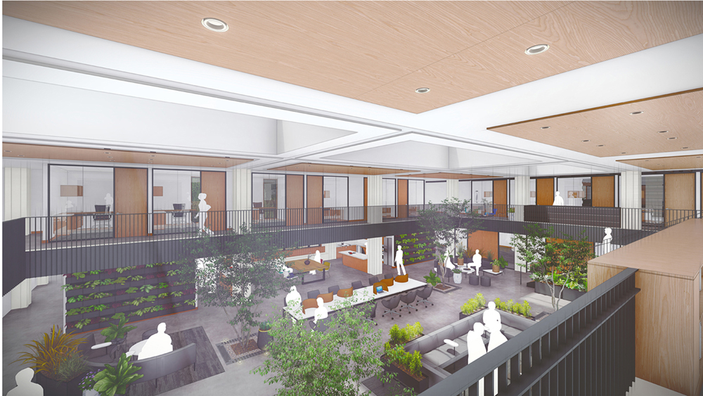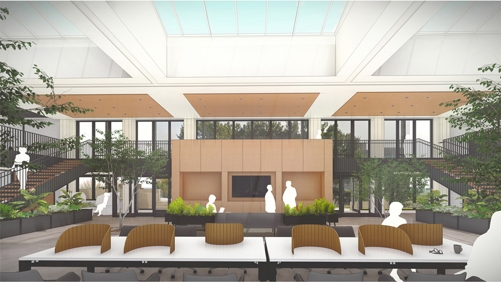In addition to outdoor workspaces, the courtyard will include an 850 square foot community garden that will provide fresh produce to the neighboring foodbank, fostering community connections.