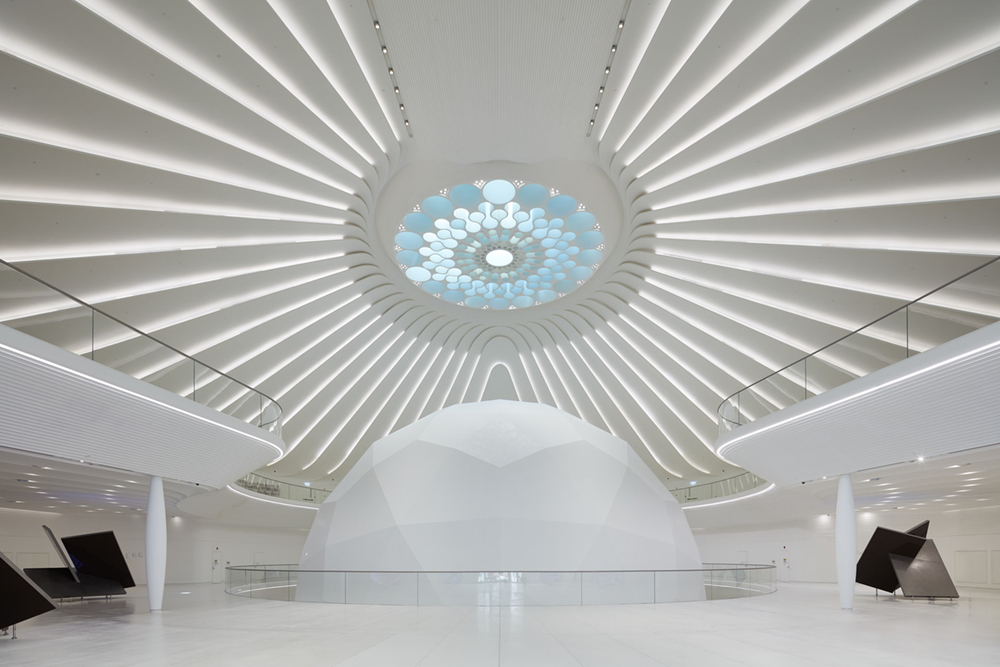 The UAE Pavilion’s steel roof is comprised of an array of 29 steel ribs set out radially span the façade of the pavilion and provide the structural framework of the roof’s sheltering form. A compression ring beam at the apex of the roof and a tension ring beam along the concrete perimeter wall supports each rib at two points, allowing for the wings to float without touching the ground. A total of 46 specialized hydraulic actuators allows the wings to open in a synchronized motion in just 3 minutes. The white colour and locally manufactured carbon fibre composite material and finishes of the wings allows for the roof to reflect ample sunlight and thus reduce solar gain, in response to the harsh sun and heat common to the region. Upon opening, the movable wings reveal the photovoltaic panels embedded within them which have been designed to absorb sunlight to harvest energy. Once closed, the wings shelter and protect the photovoltaic panels from rain and sandstorms.