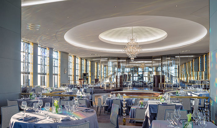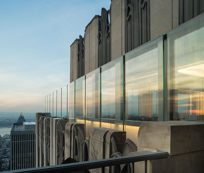 The architects incorporated several custom designed elements that carry forward the memory of the celebrated space while satisfying the present programmatic needs. In the Rainbow Room, a revitalization of the rotating dance floor, mesmerizing crystal window veils lining the 15-foot windows and restoration of the historic chandelier and central dome reinforce the intention of creating modern day grandeur. Custom designed carpet and furniture is featured throughout the 65th floor. In SixtyFive, afaceted ceiling made of glass reinforced gypsum panels anchors the center of the space, reinterpreting the feeling of open-air height the room once had when it was an open air sun parlor in 1934. Structurally, the window apertures in the Pavilion were modified to recreate the experience of this expansive viewing portal.