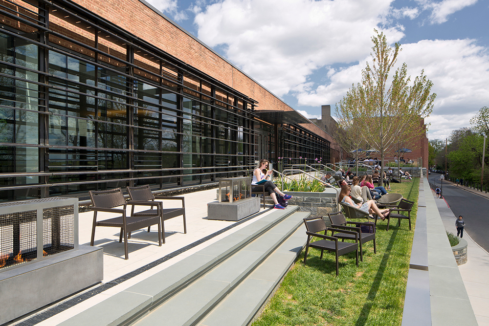 The Riverside Terrace is an outdoor landscaped area that extends the living space of the Great Room outdoors and overlooks the Potomac. Supporting the casual and study spaces of the student center are a pub and smoothie café that offer alternative food venues to the campus dining hall.