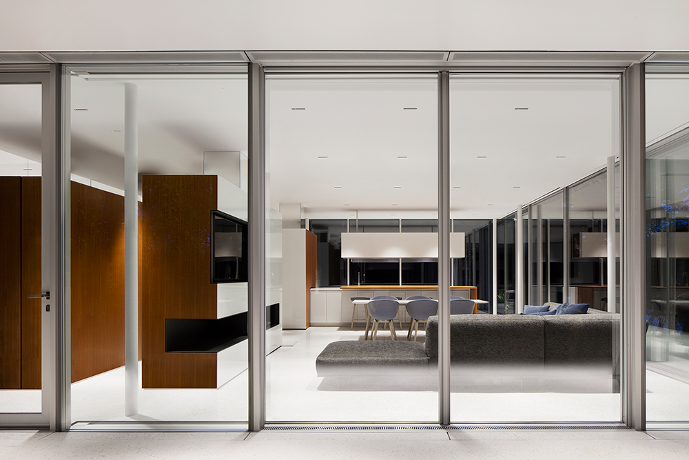 Every part of the pavilion is marked by careful detailing, from the clarity of the glazed exterior corners, to the expression of the floor and ceiling as single continuous planes, to the services that are concealed within a pure wooden volume that serves to separate the public and private spaces.
