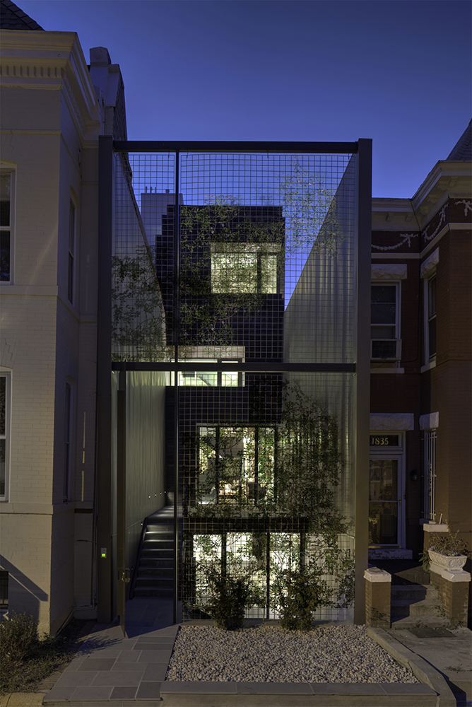 Two metal clad walls veil the adjoining masonry row dwellings and act as light baffles and support for vertical gardens.