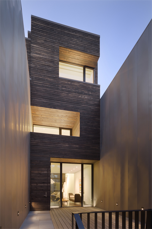 A three- story volume clad with burned siding is inserted between the walls and houses living quarters and a roof deck. Incised through this volume, a perforated steel stair animates the interior and allows daylight to saturate the house. A stucco clad service volume supports the metal walls and wood volume as they cantilever towards the alley.