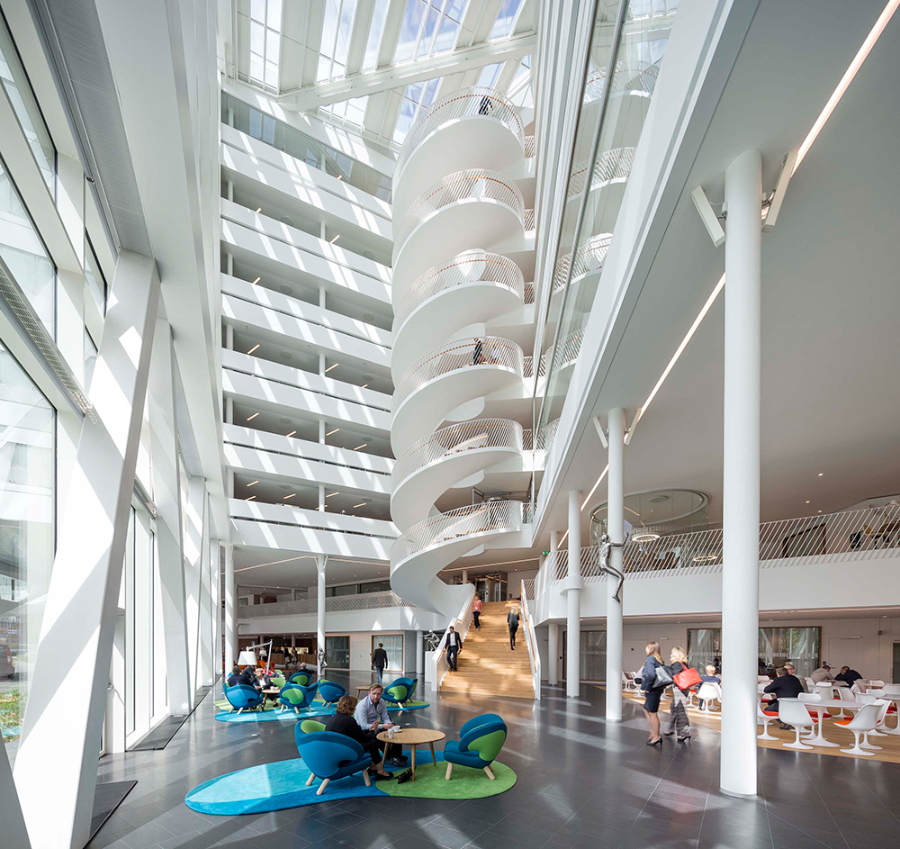 The legs of the ‘V’s are linked across the atria by open footbridges springing from floor to floor, making them more than internal shortcuts with extra office space and providing visual contact – they also create variation between the floors. The office floors thus feature openness and varying spaces designed to ensure a healthy working environment with a clear, human scale in a large building.