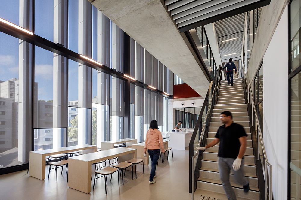 Faculty staff are located adjacent to the laboratory core, with the perimeter occupation centred around three story atria to enhance the collegial life of the school and building occupants. The building is public in orientation; there is no front or back.