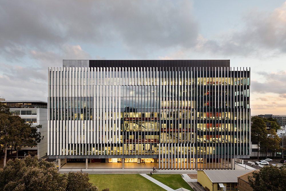 The internal prospect of the collaborative spaces and a high-performance façade with sandblasted cast GRC louvres that twist in response to solar orientation configure the building’s expression, while the base is periodically lifted to present the positions of entry and expose the Michael Crouch Innovation Centre.
