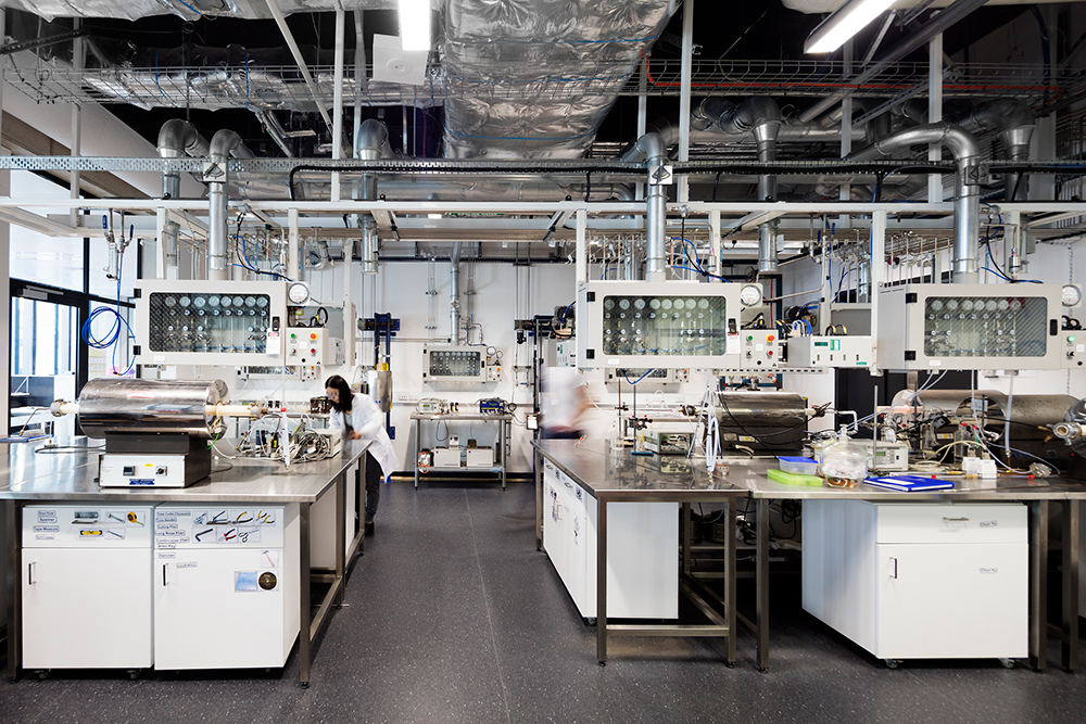 Offering a modular and reconfigurable laboratory system, bound by services cores and circumscribed by write-up spaces, offices, and meetings rooms that connect vertically and encourage collaboration at the interface of the researchers’ activities.