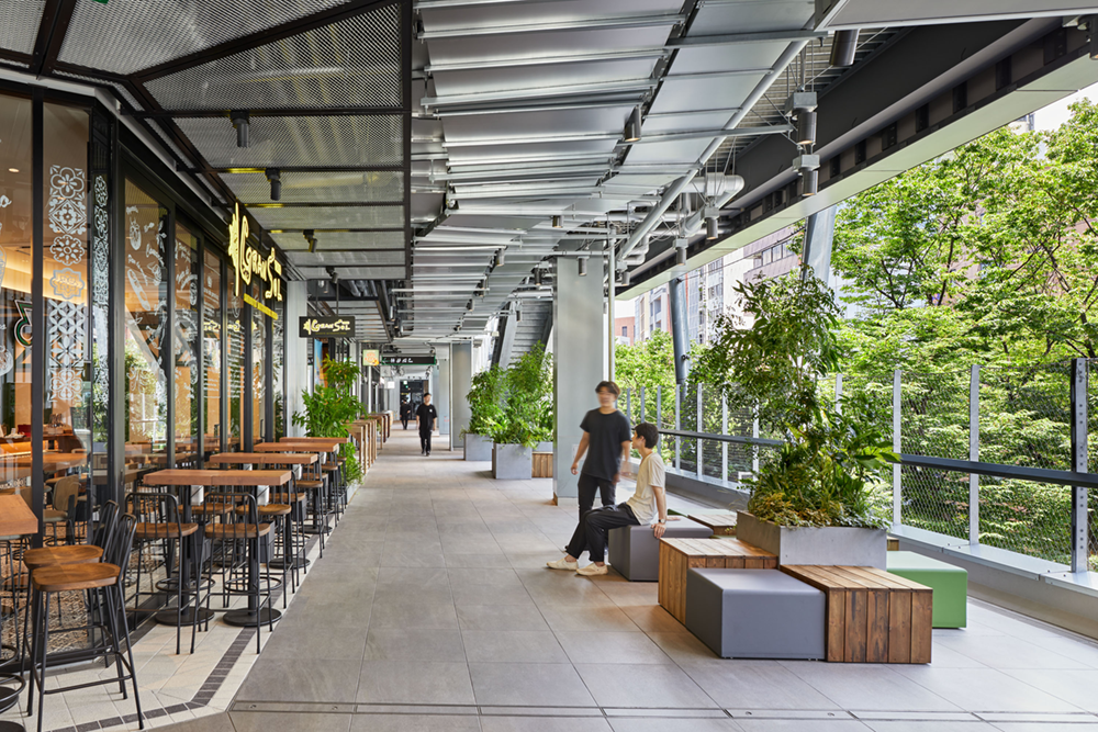 Greenery and furniture are also casually arranged in the mall parts, with the aim of providing a new park-style commercial facility where time can be spent, as in a park. The terrace space of the broad Outer Mall is a well-ventilated space where the stores’ furniture and bridge furniture are arranged.