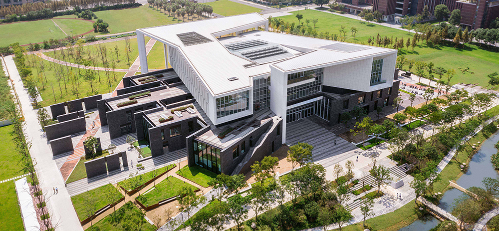 Teaching Building The systems of the building are showcased so the construction methods can be observed. The building is itself an extension of the classroom and as such, a learning tool. Built to US Green Building Council’s LEED Gold and China Green Building’s Two-Star standards, the sustainability features include façade sunshades, a rooftop photo-voltaic array, rainwater harvesting, thermal mass walls, heat recovery system, and a passively cooled atrium. As it holds the center of the campus and brings disciplines together, Ge Hekai Hall is both the symbol and realization of a nexus of creativity that unites Wenzhou Kean University in China with its associated Kean University in the United States. The project provides a multi-functional platform for research and learning that links educational programs and cultures for coming generations.
