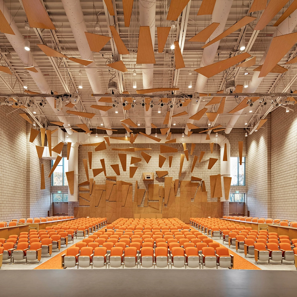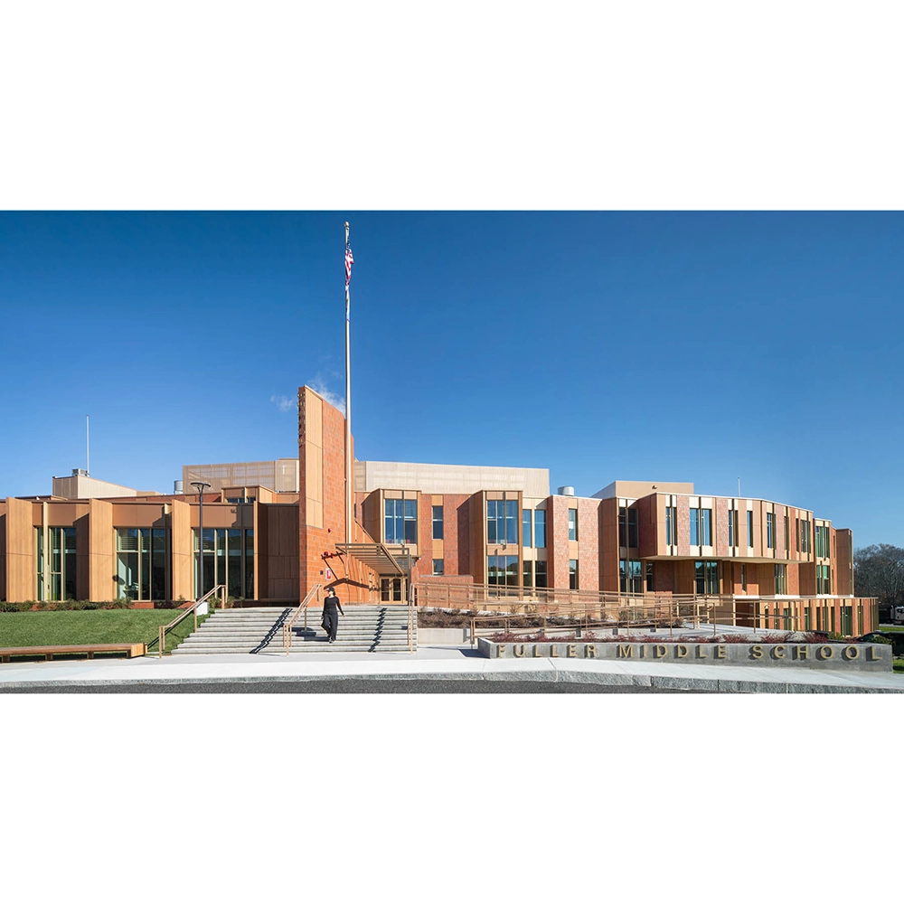 Forwarding the broader community's goal of creating a new civic focus for South Framingham, the building is set back beyond a sloped outdoor amphitheater with a performance shell, serving as a gathering lawn for students and venue for town-wide events and performances. The building is oriented for energy efficiency and sustainability purposes and utilizes a compact footprint to conserve site space and create a sloped campus open space that unifies the District's three buildings into a cohesive educational grouping.
