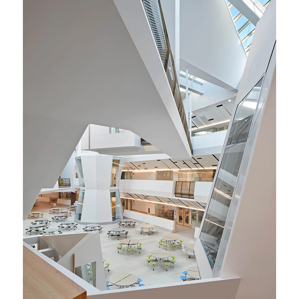 At the center of each of these is a medium-sized collaboration space. These spaces are located on balconies overlooking the main Learning Common and relate visually to one another. Also located on balconies directly adjacent to the classrooms they serve are several multi-use breakout spaces, also highly visible to one another and the Learning Common. Each cluster also includes a pair of science Exploratories or classrooms at its center.