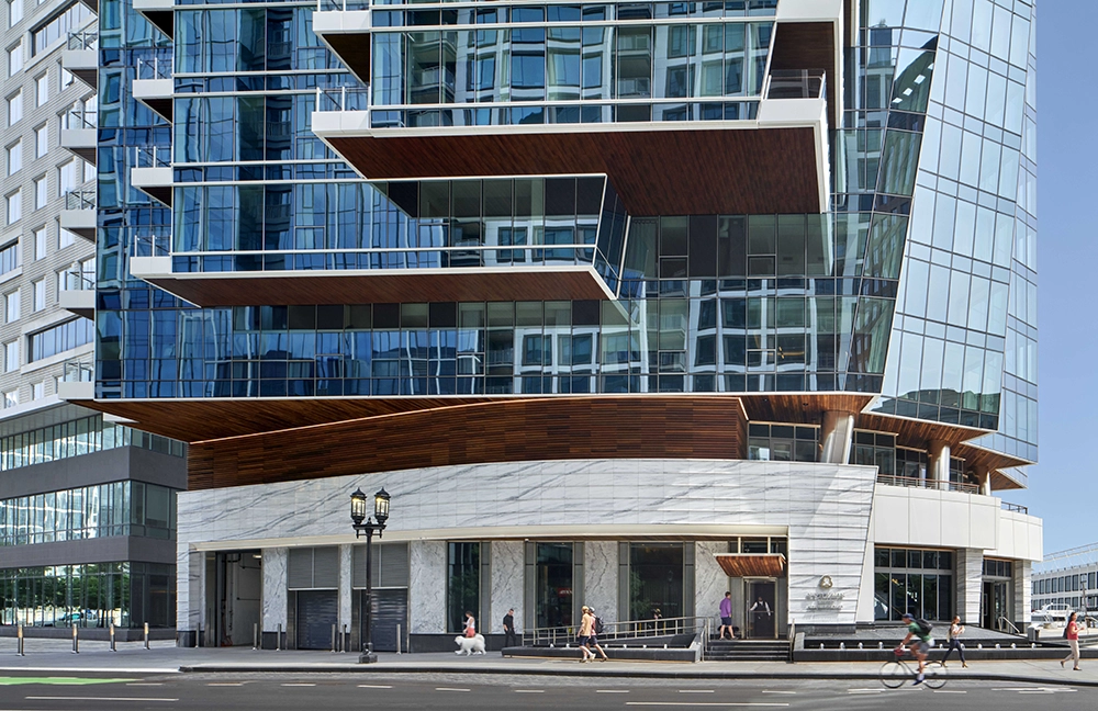 The architecture of the St. Regis Residences was guided by four principal objectives: - Evoke the neighborhood's historic ties to shipping - Take advantage of site constraints to create vertical proportion and add complexity to the building design - Design a building that is resilient and sustainable - Fully activate the waterfront and draw the public to Boston Harbor At street level - with its white curved planes, glass and metal panels, textured white marble pillars, and oiled ipe wood - the exterior evokes the bows of wooden schooners on the waves.