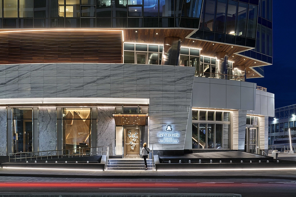 Complex, compelling, and aesthetically arresting, the design of The St. Regis Residences evokes a schooner under full sail. At 22 stories high and 250 feet tall, the building sits on a highly constrained 15,504-square-foot lot with limited terra firma and appears to twist on its central axis as it rises, with five deep pleats on the east façade. The top of the pleats twists toward the north and the bottom toward the south, giving the building movement and visual drama. Only the east façade of the building has a twist; the three other façades are perpendicular, acting like a sailboat's masts, bringing stability and a central element around which other elements of the design are organized. On the south façade, three “sails” - projecting bays that rise the vertical height of the south side of the building - are a counterpoint to the east façade.