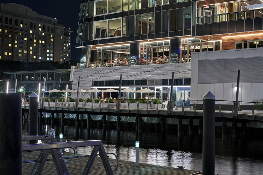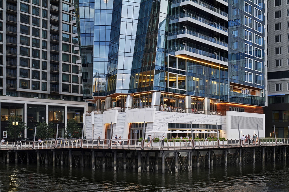 The form of the building changes when viewed from different directions and distances, seeming to shape-shift for passersby on the street, the water, and along the Harborwalk, the 45-mile-long public pathway that traverses the perimeter of Boston Harbor. The building includes three levels of below-grade parking and an 8,138-square-foot, two-story restaurant with 2,073 square feet of additional exterior terrace space connecting to the Harborwalk. Public open space including the Harborwalk and adjacent Massport Wharf occupies approximately 60% of the ground floor. The restaurant, SAVR, on the first and second floors, features outdoor seating on the second-level terrace and along the Harborwalk. The entire exterior is a unitized curtain wall of silver-blue glass, and residences enjoy spectacular views in all directions. The innovative nature of designing distinctly different façades provides many more rooms with views than a traditional rectangular building shape could offer. Designed to LEED-NC Silver standards, the building is raised for protection during storm surges and includes a deployable flood barrier system. Primary electrical transformers and critical life safety systems are located on or above the second level of the building.