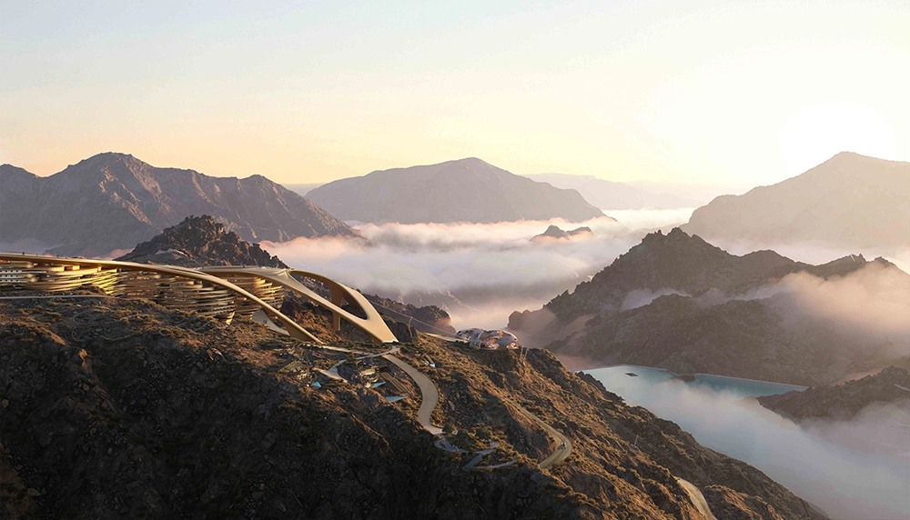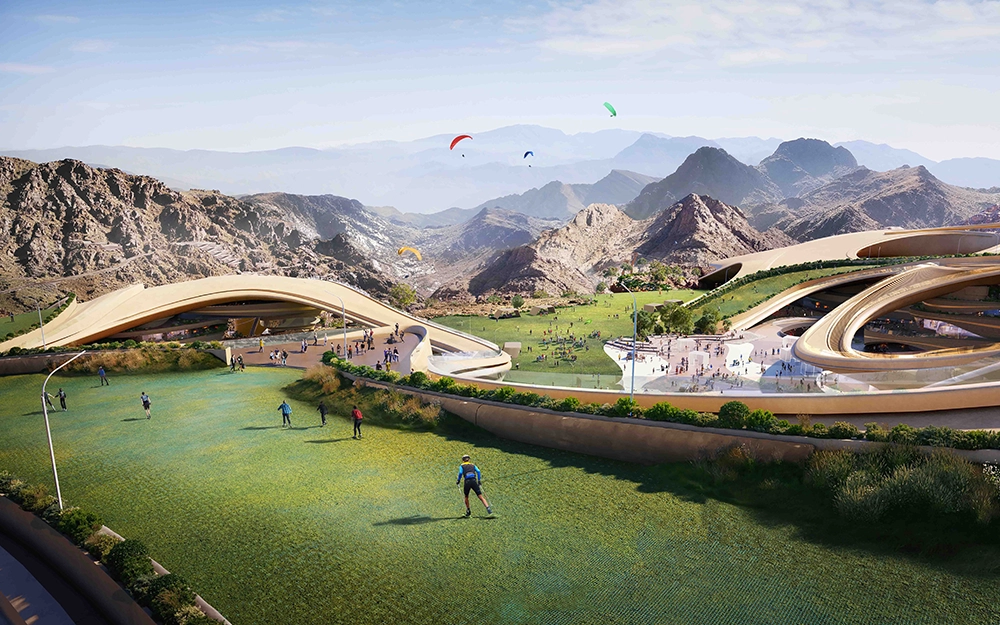 This iconic asset, Trojena Ski Village, showcases breathtaking landscape views and offers various fun activities at the highest standards of hospitality. Located 2.5 kilometers above sea level, it provides a panoramic view of the Gulf of Aqaba and The Lake. The village features innovative Bio-Tech Materiality, Design and Engineering Solutions and is divided into five major zones connected through the roof and ground floor. The sloping roof is activated with sports and rooftop cafés, seamlessly embedded into the landscape. NEOM Mountain Masterplan aims to establish a world-renowned tourist destination with unbounded experiences, focusing on Discovery, Adventure, and Sports.