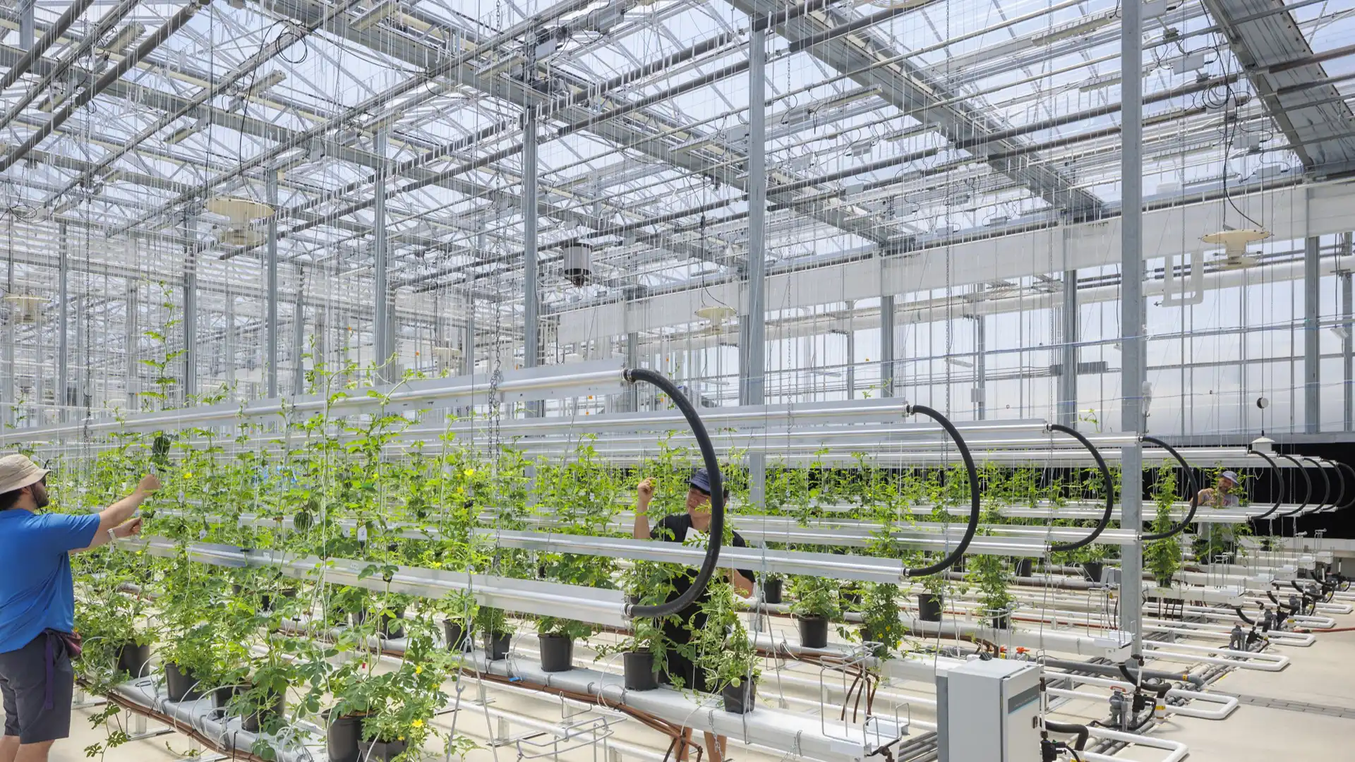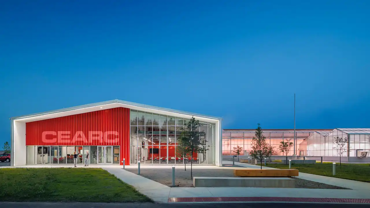 The design of the Controlled Environment Agricultural Research Complex (CEARC) integrates both indoor and outdoor campus functions to advance food production studies. The facility features a headhouse for administrative, teaching, and lab functions, paired with two distinct greenhouses—one for large-scale production and the other for specialized research. The greenhouses are compartmentalized to accommodate diverse research needs, such as tall and short crops, aquaponics, small-scale production studies, and isolated biosafety-level research. Constructed with innovative envelope systems like ETFE transparent roofing in the Production Greenhouse, the greenhouses provide adaptable environments with advanced environmental control systems. Exposed piping, ductwork, and conduit throughout the complex highlight its functionality and enhance the educational experience, reinforcing the facility's commitment to innovation and hands-on learning. Plant research and education is elevated in this facility through transparencies into labs and the production greenhouse compartments that are served by generous corridors that allow for both an extensive potential for systems service as well as educational touring.