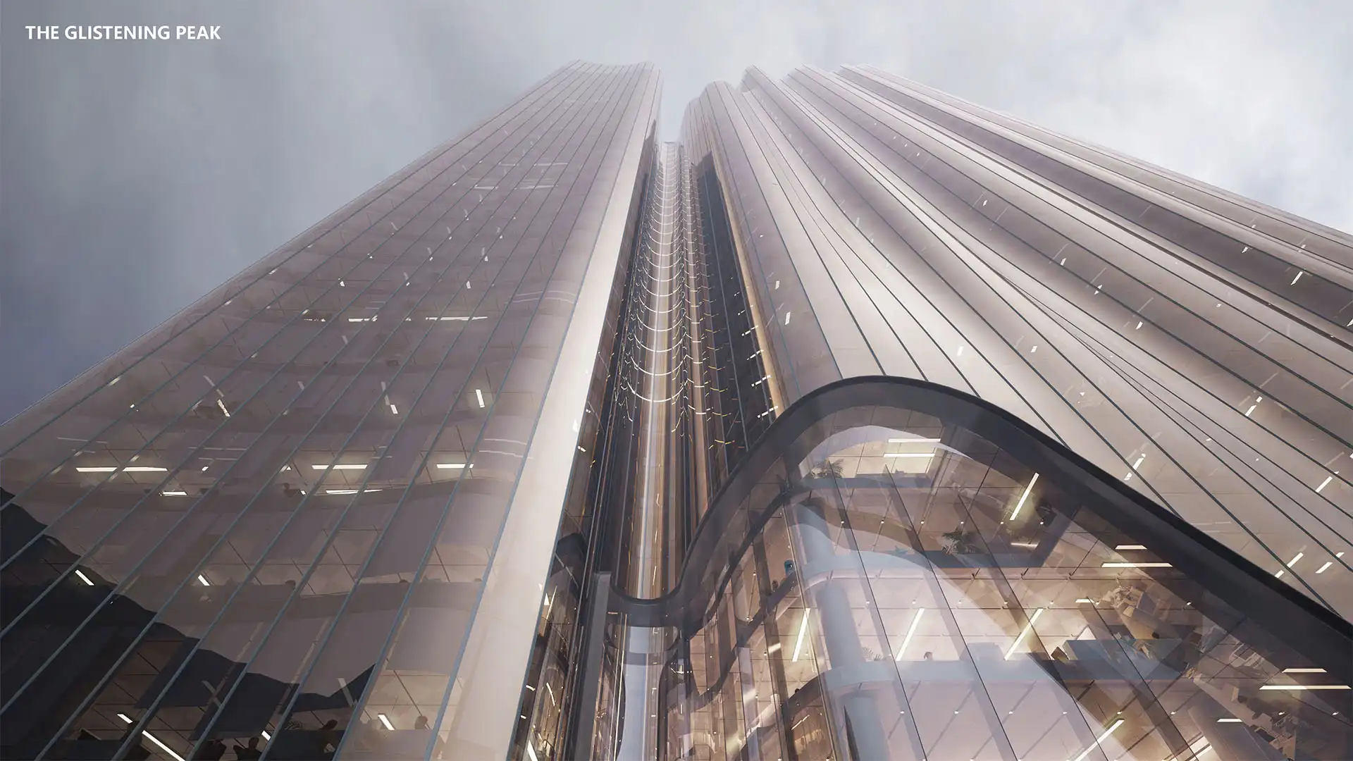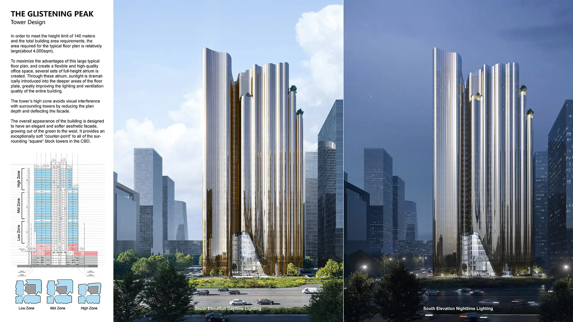The 140-meter tower includes a substantial typical floor plate of approximately 4,000 sqm. To optimize this scale, multiple full-height atriums dramatically enhance natural light penetration and ventilation, improving interior quality and user well-being. In upper levels, the tower reduces plan depth and deflects the facade to minimize interference with adjacent structures and maximize scenic views.